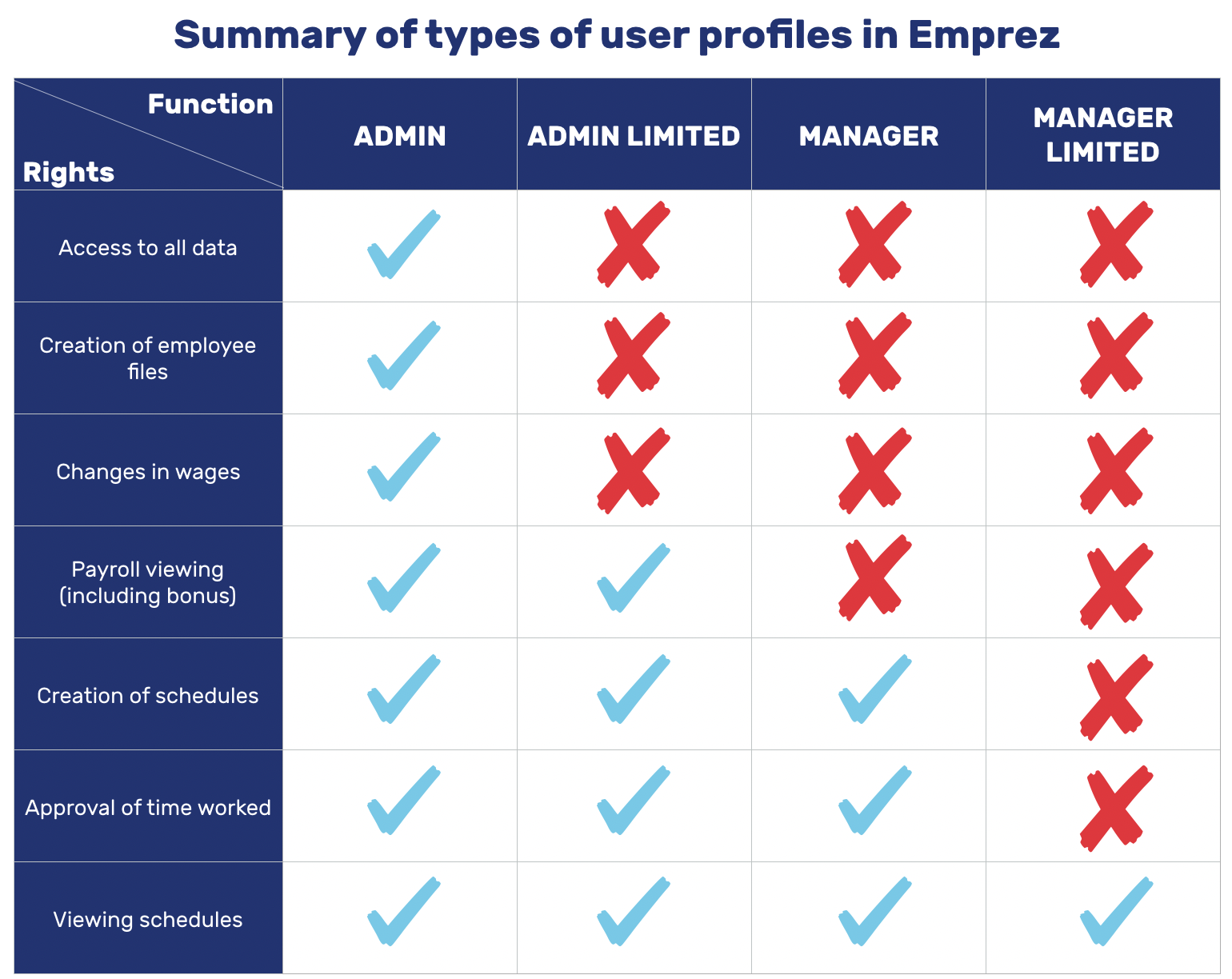 In Emprez two factors impact the access of a user: Its access type (role) : (Table of access rights according to profile) Manager : Super Admin, Admin, Limited Admin, Manager, Limited Manager Employee His rights: The company, the services and ...