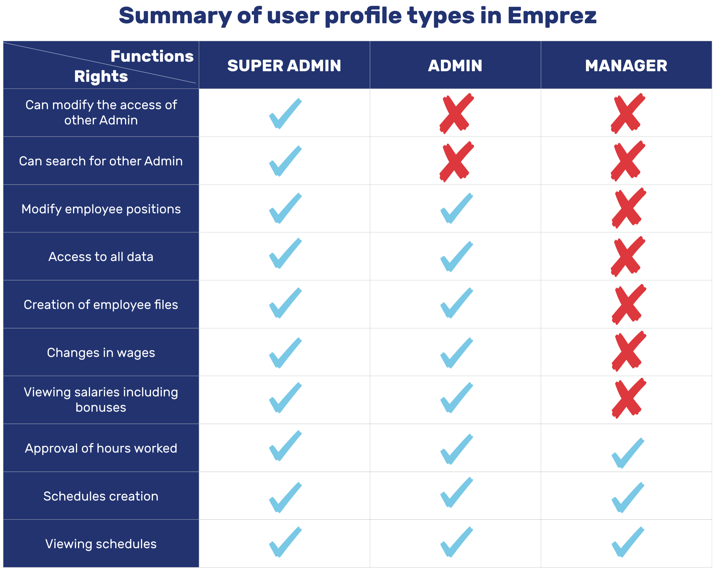 Here is a general summary table of the access rights of a Super Admin compared to a standard Administrator and a Manager: