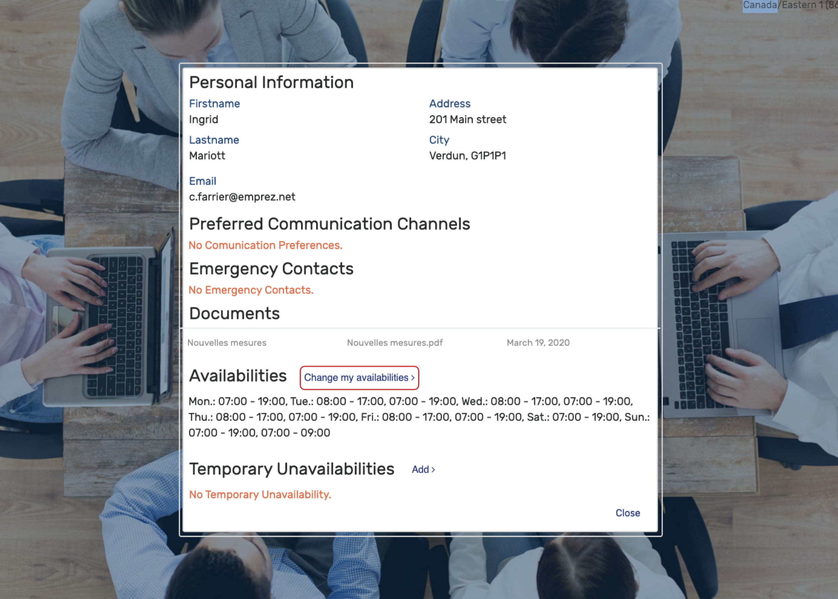 Emprez allows you to submit work availabilities directly from the Employee Portal. Availabilities are considered to be those days and times that you will regularly be available for work. Once your availabilities have been approved, management will receive an alert if they create a shift for you that conflicts with your registered availabilities.