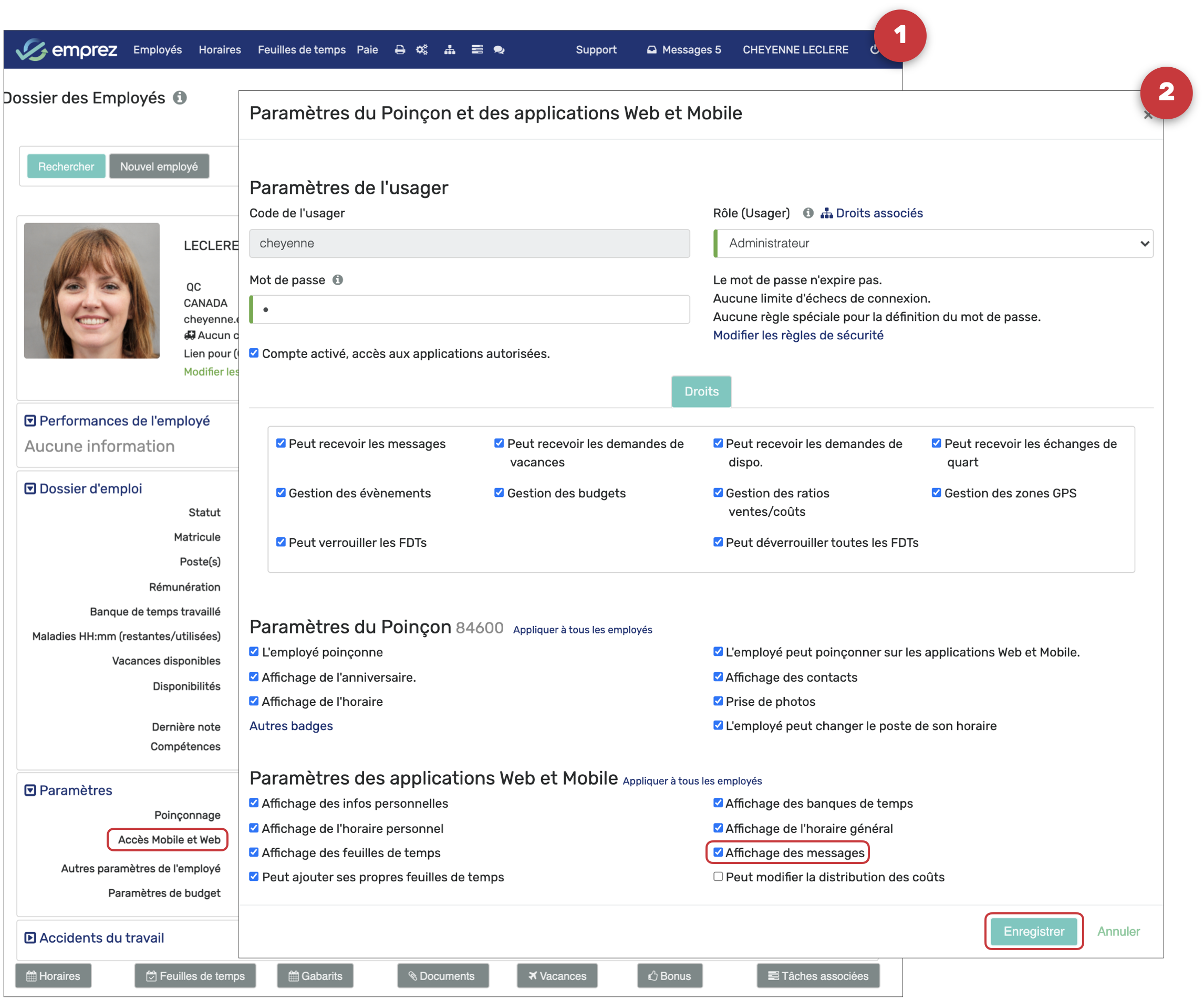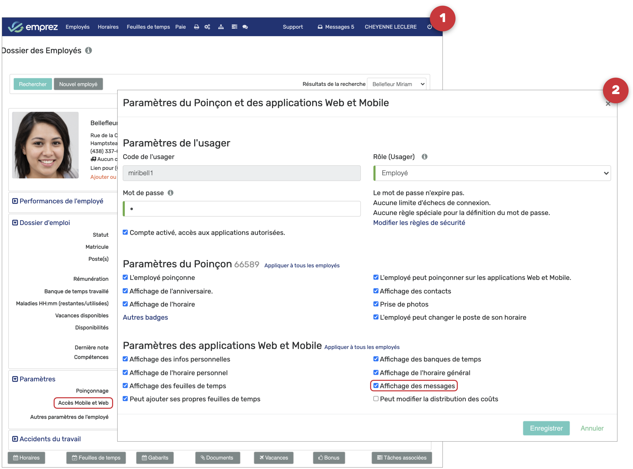 Dans le dossier de l'employé, cliquez sur Accès Mobile et Web, cochez la case Afficher les messages, puis cliquez sur Enregistrer.