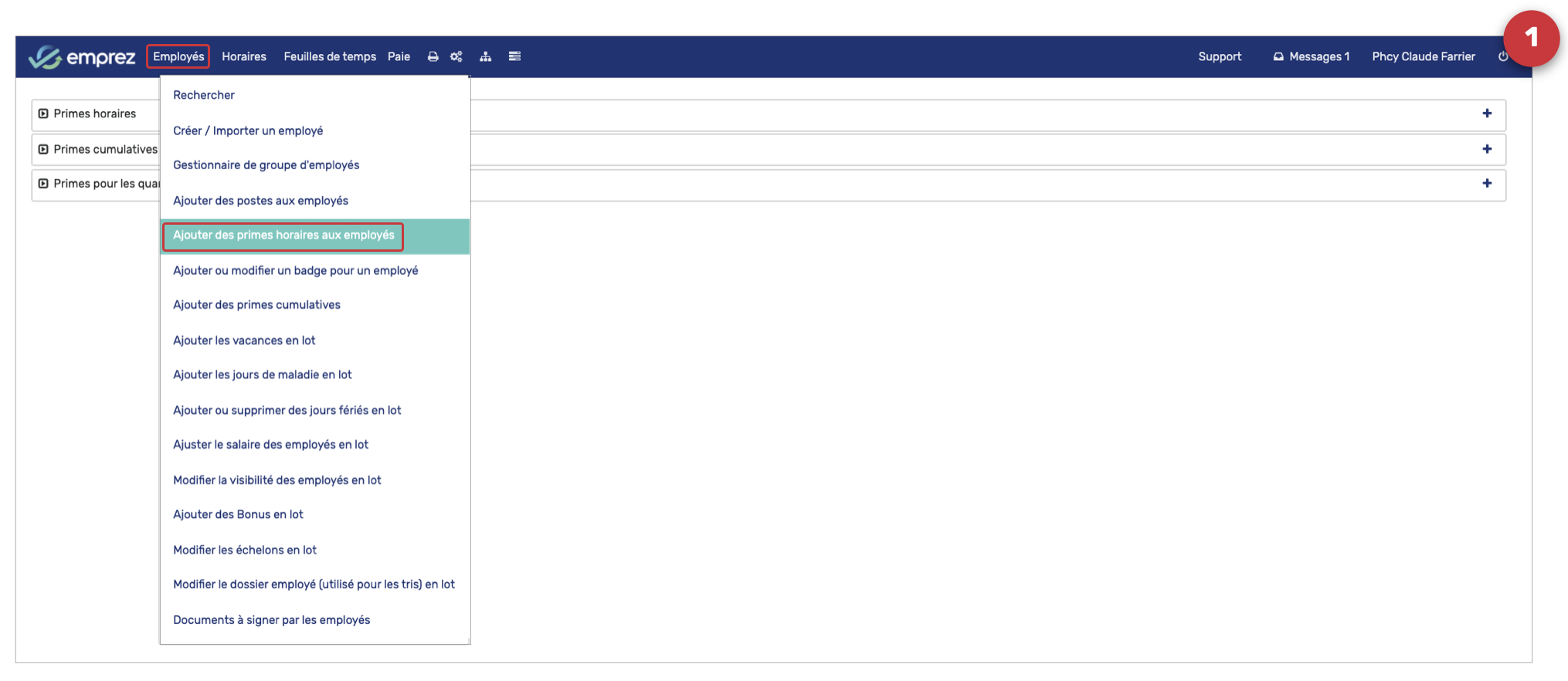 - Dans le menu principal, cliquez sur le menu Employés, puis choisissez le sous-menu Ajouter des primes horaires aux employés,