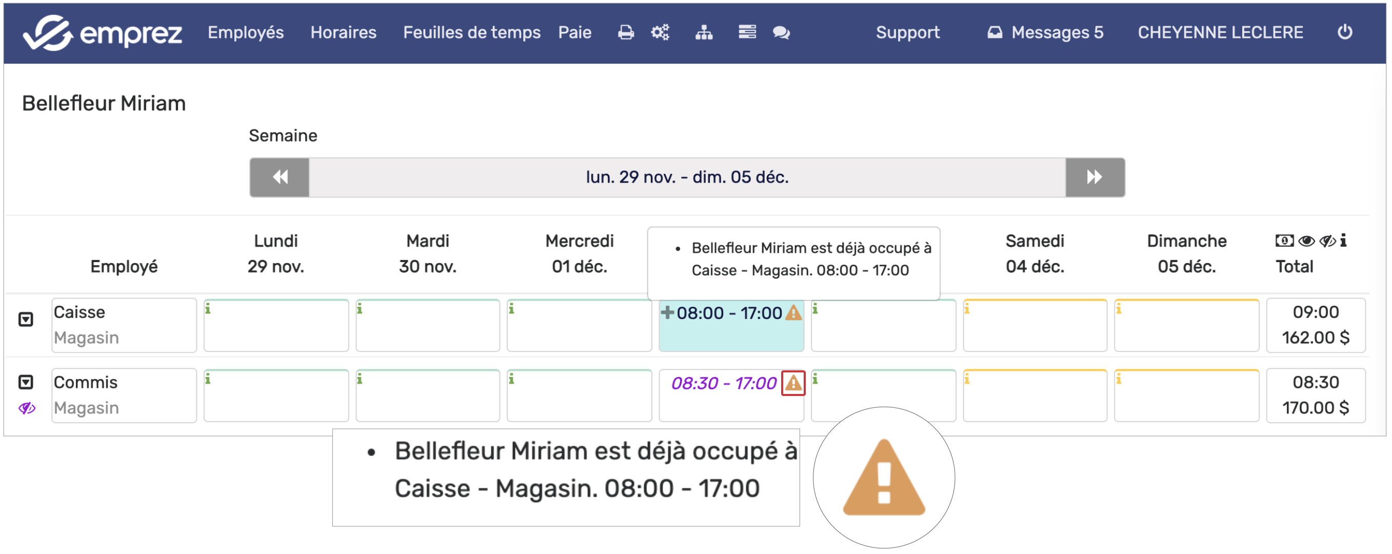Si lorsque vous mettez à l’horaire des employés, vous avez des erreurs comme quoi l’employé n’est pas disponible, il se peut qu’il y ait un problème avec ses disponibilités dans le système.