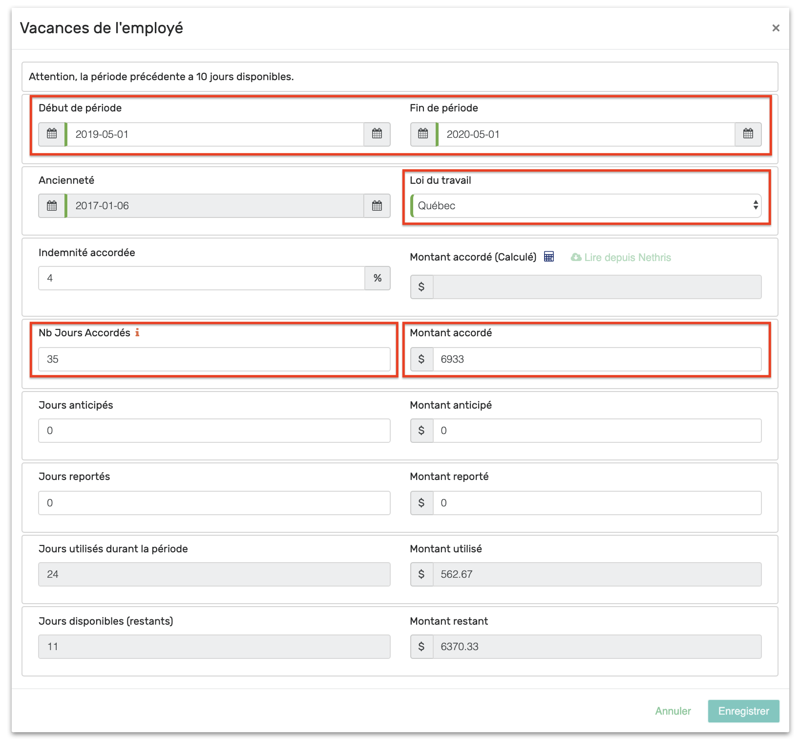 « Indemnité accordée » correspond au versement que l’employé à droit pour la totalité de ses vacances. Ce pourcentage change en fonction de l’ancienneté de l’employé. Vous devez l'ajuster manuellement.