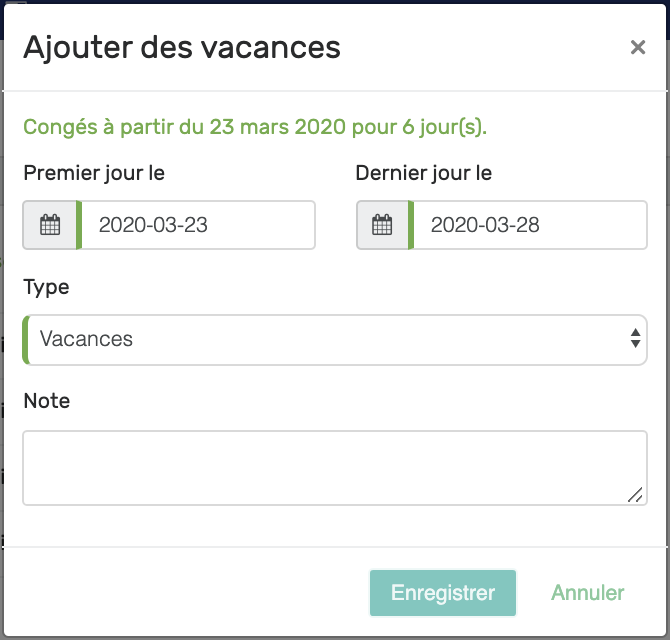 - Date de début et fin de la période à ajouter (inclusivement)