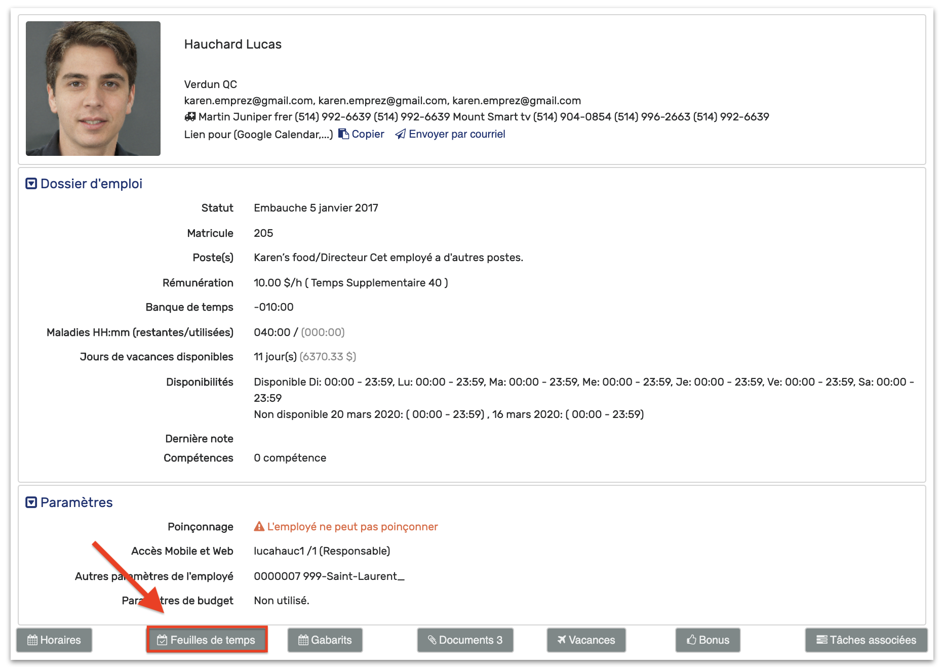 - Cliquez sur Feuilles de temps, en bas à droite dans les boutons gris