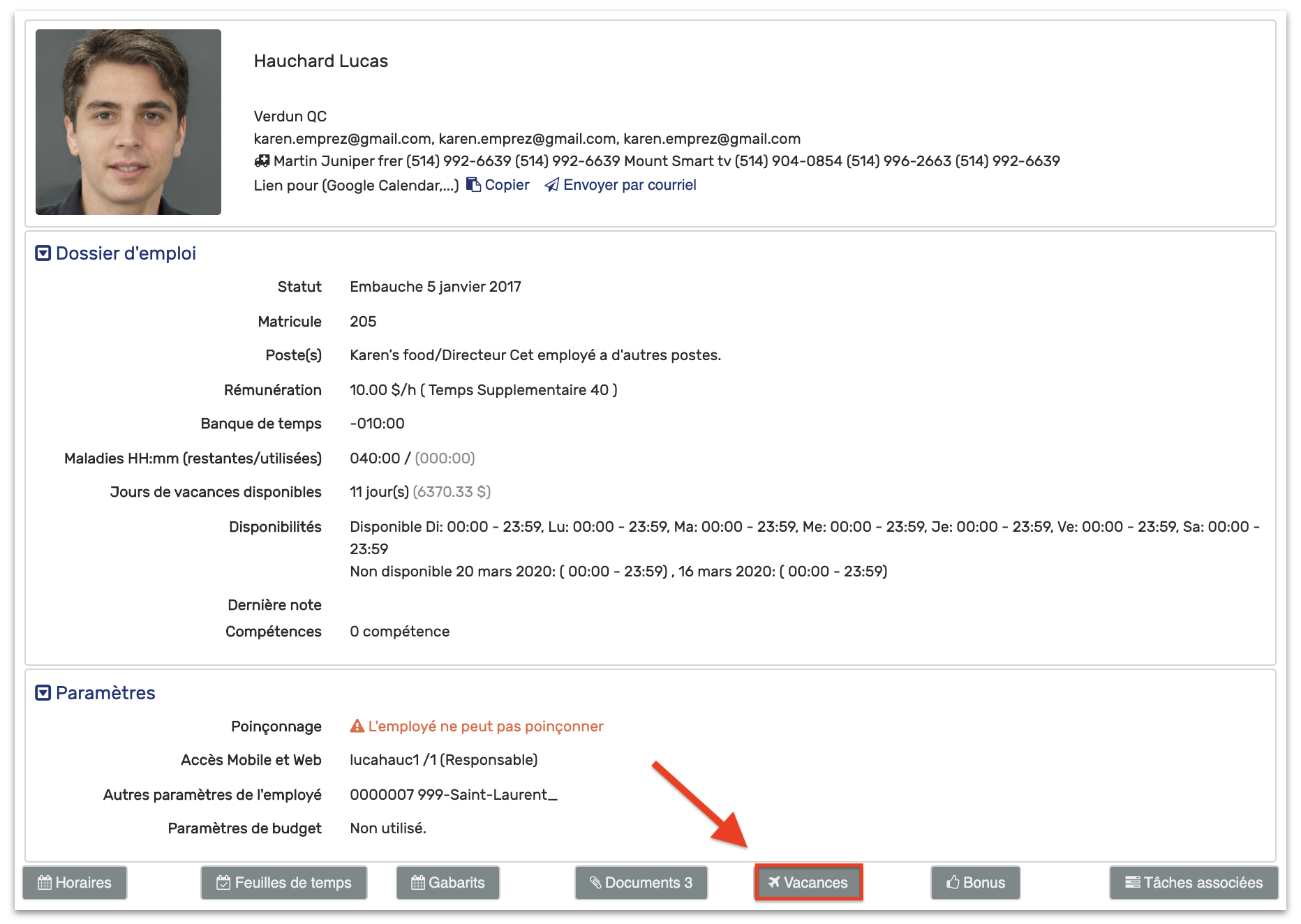 Si vous n'avez pas Vacances dans les choix de Type de quart, vérifiez le solde en jours et en argent de votre employé (plus bas dans cet article).