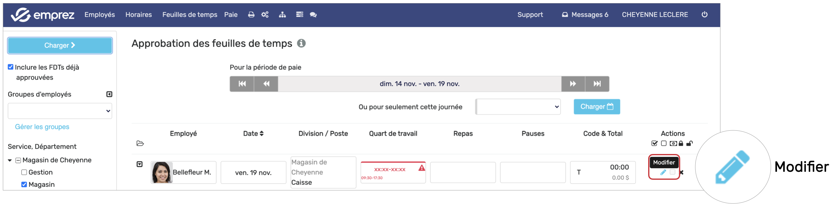 Seuls les usagers de type " Responsable" et " Administrateur" sont en mesure de modifier les feuilles de temps des employés. Vous pouvez désormais apporter des modifications à des feuilles de temps passées (dont la date précède la période de paie). ...