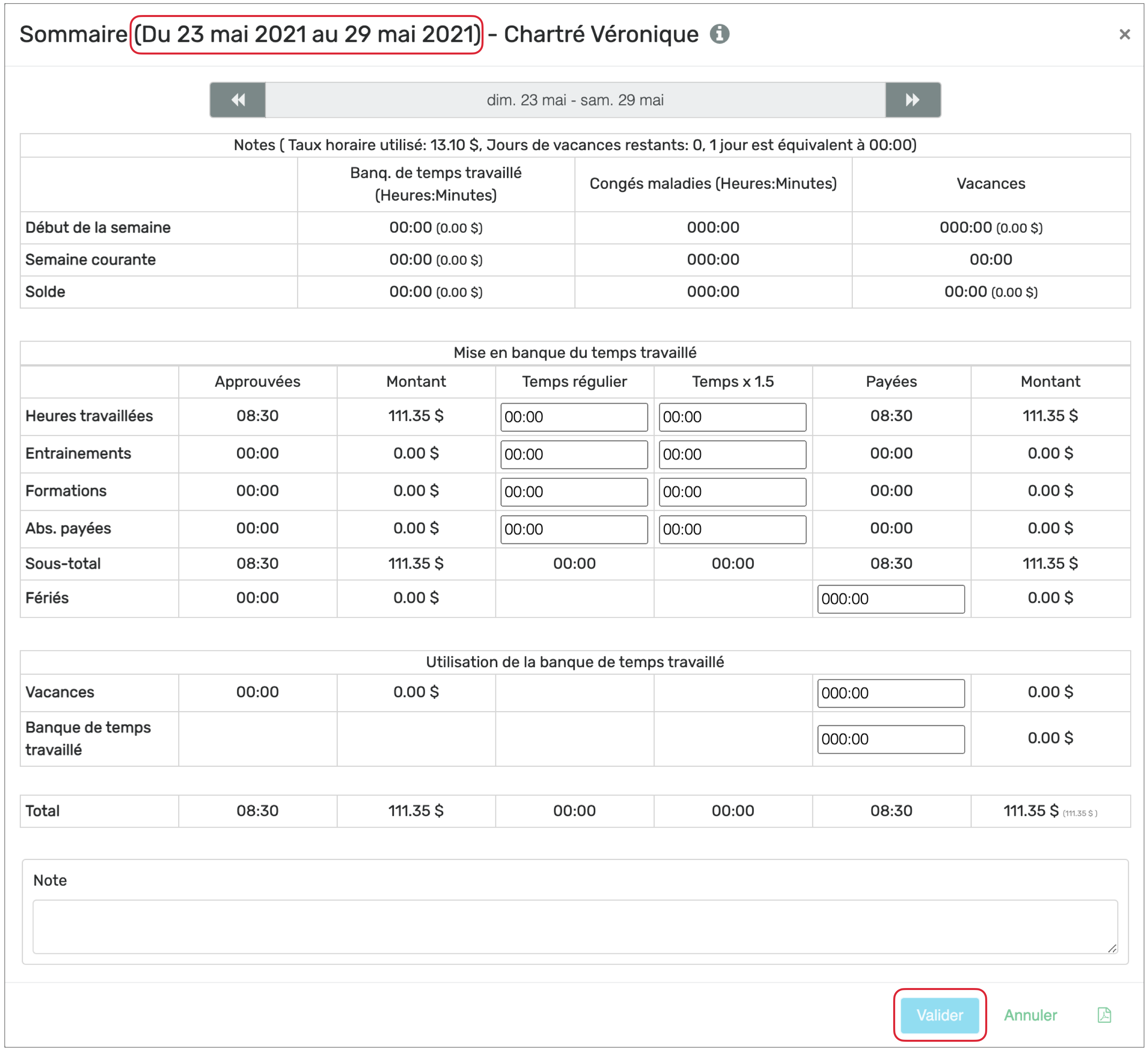 NB : Si une feuille de temps de la semaine est verrouillé, l'ensemble du résumé hebdomadaire sera verrouillé, vous pourrez le consulter mais pas l'enregistrer.
